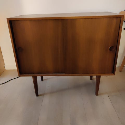 Har 2 identiske Skænke i massiv Teak med glasskydelåger. Nypris 9900kr pr stk