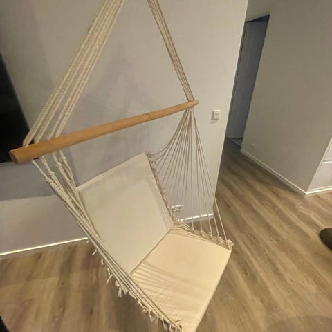 Super behagelig Hængestol transporteret fra Oaxaca i håndbagagen for en del år tilbage. Den er egentlig aldrig brug fordi jeg aldrig har haft et sted jeg kunne hænge den. Der skal lidt højde til. Men nu skal den have et nyt liv. Kan hentes på Østerbro, Kbh.