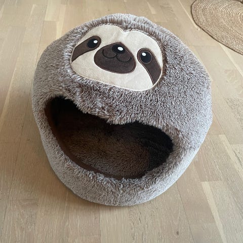 Zooplus katteseng i huleform i grå og hvid. Sengen har blød, plysforet inderside og aftagelig pude i hvid plys. Ydersiden er i blødt gråt stof. Egnet som liggeplads og skjulested til kat eller lille hund. Kan placeres på gulv eller anden plan overflade i hjemmet.