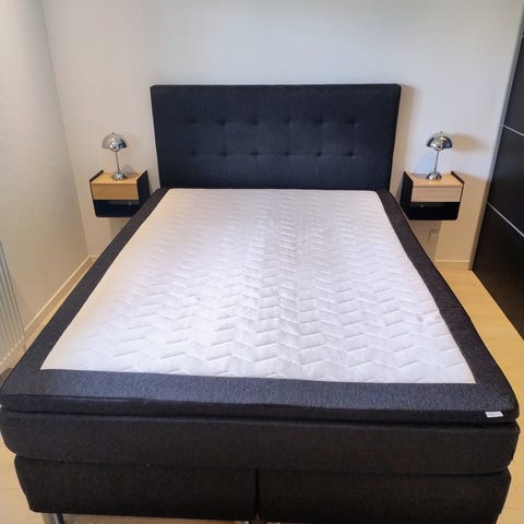 Seng med gavl sælges pga. flytning. Brugt i et røgfrit hjem uden husdyr, er i fin stand.