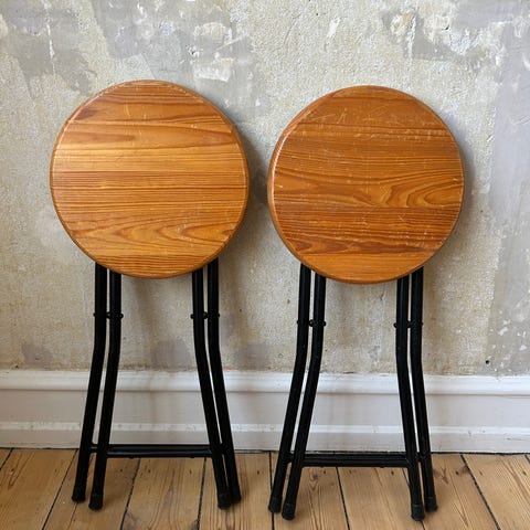 To skamler i lyst træ. Skamlen er udført i lyst træ med synlig årestruktur og har en let buet rektangulær siddeflade. Konstruktionen består af fire ben med tværstivere for stabilitet. Egnet som ekstra siddeplads eller som lille afsætningsplads i for eksempel køkken, entré eller stue.