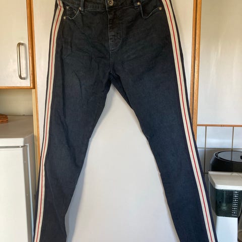 Zizzi capri jeans, str. 46, blå, i strækbart stof med rynkedetalje forneden, benlængde 45 cm, hofte 118 cm, talje 94 cm, er brugt nogle få gange. Fra røgfrit hjem.