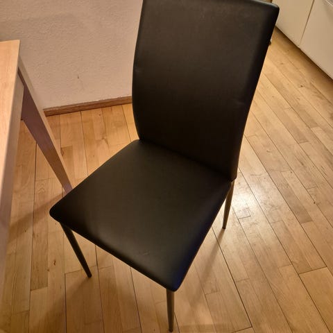 Spisebordsstole i gråt stof med sorte ben. Stolene har polstret sæde og ryglæn og er velegnede til brug ved spisebord i køkken eller spisestue. Neutralt design der passer ind i mange indretningsstile.