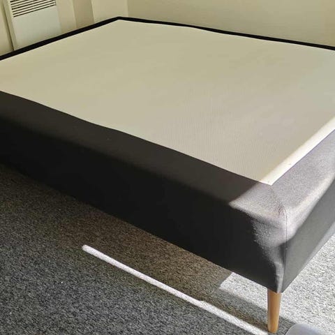 Sengens hovedgærde måler ca. 190(L) x 100(H) cm. De længste dele fra sengerammen er 210 cm. Lamelbunde medfølger.