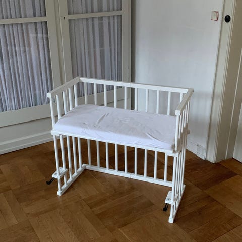 Babybay bedside crib i hvid. Sengen er designet til at stå tæt op ad forældresengen, så barnet kan ligge i samme højde. Åben side mod forældresengen giver nem adgang til barnet om natten. Træramme med tremmer og buet gavl. Egnet til spædbørn som første seng. Madrassen kan justeres i højde afhængigt af forældresengens niveau. Kan bruges som babyseng ved siden af sengen i soveværelset.