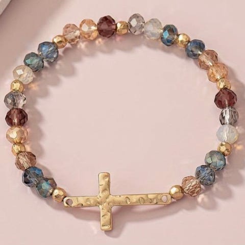 Yndigt lille elastikarmbånd med forskellige krystalperler og forgyldte metalperler. OBS, armbåndet er ret lille, passer kun håndled op til 16 cm. Perlerne er cirka 4 mm og der er et lille forgyldt kors som vedhæng. Armbåndet er nyt