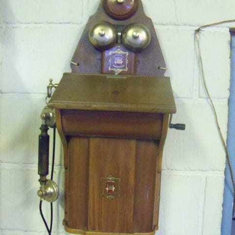 Træ vægtelefon, vintage væg telefon den ene klokke mangler. Den er fra jysk telefonaktieselskab.. Egnet som samlerobjekt eller dekoration.