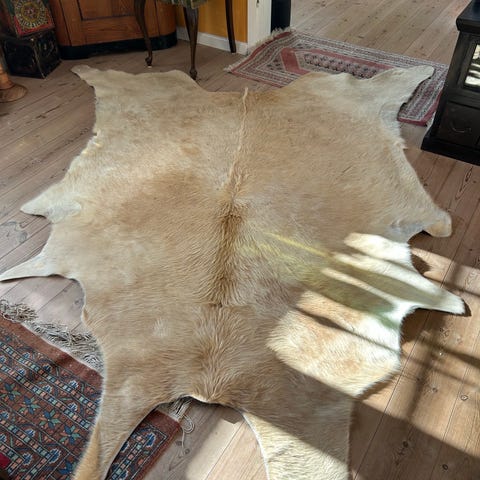 IKEA koskind tæppe i brunlige nuancer med naturligt mønster. Tæppet er fremstillet af ægte koskind med hårlag på forsiden og glat bagside i læder. Formen følger skindets naturlige kontur. Velegnet som gulvtæppe i stue, soveværelse eller andre opholdsrum, eller som dekorativt element over en sofa eller stol. Farvetonen varierer i brune og mørkere felter, som er en del af skindets naturlige udseende.