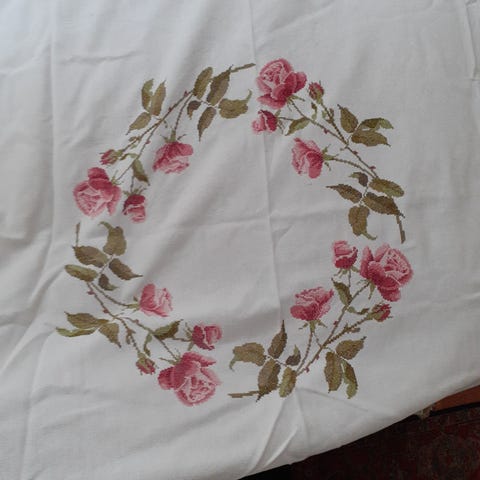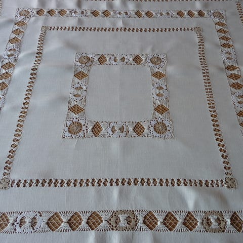 Kvadratisk håndbroderet dug 135x135 broderet med fladsyning, hulsøm og venetiansk broderi. Meget flot og sirligt håndarbejde.