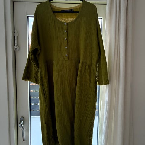 Hverdagskjole i grøn linned (hør), one size. Mærke ukendt.