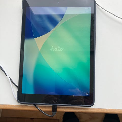 Apple iPad 8 tablet med 32 GB. Enheden har touchskærm på forsiden og kamera på bagsiden. Bagsiden er i mørk grå farve. På billederne ses, at frontglasset har synlige revner i et hjørne af skærmen. Der medfølger et blåt beskyttelsescover, som er vist ved siden af iPad’en.