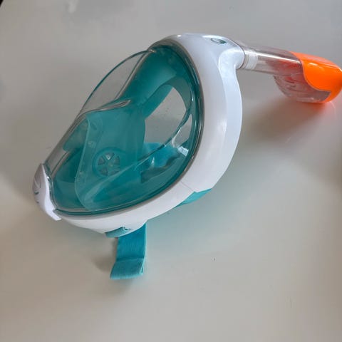 Cruz Full Face Mask snorkelmaske i sort. Fuldmaske-design, der dækker hele ansigtet med stort klart visir foran. Integreret snorkel med orange topstykke. Justerbare elastiske remme på bagsiden for tilpasning til hovedstørrelse. Velegnet til snorkling og overfladesvømning. Leveres i original æske.