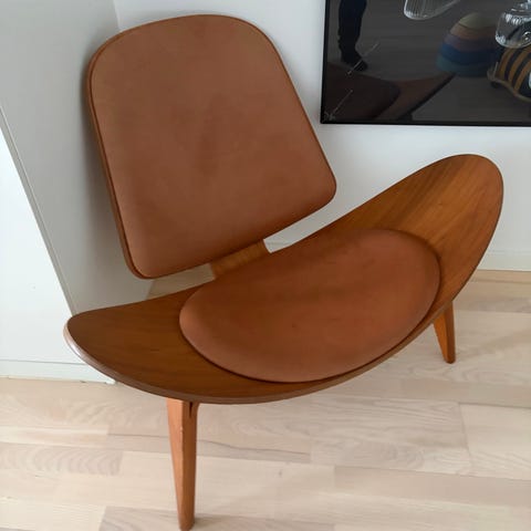 Carl Hansen Hans J. Wegner lænestol med træskal og brun læderpolstring