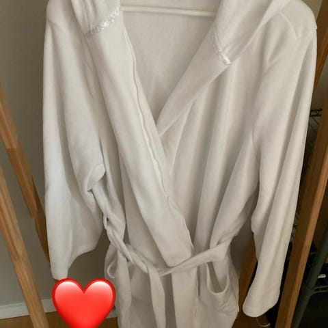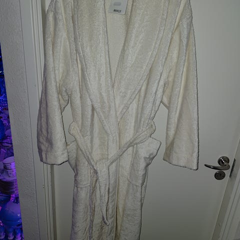 Nyvasket og som ny fra røgfrit hjem. Længde fra skuldersøm 125 cm. Lommer i siderne og bindebælte.