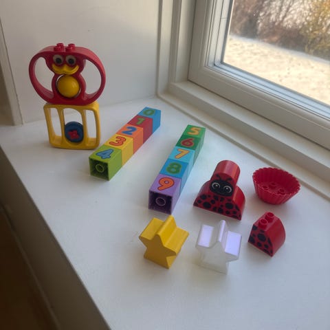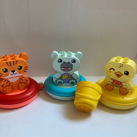 LEGO DUPLO dyrefigurer og både til småbørn. Sættet består af flere store DUPLO-klodser med dyremotiver, blandt andet bjørn, and, kat og fisk, samt farvede både og klodser i plast. De store klodser er velegnede til små hænder og kan bruges til leg på gulv eller i vand, fx i badekar eller balje. Farverne omfatter blandt andet gul, rød, blå og turkis. Sættet kan kombineres med andre LEGO DUPLO-sæt.
