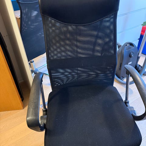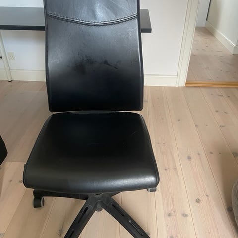 Kontorstol i sort. Stolen har polstret sæde og ryglæn samt femstjernet fod med hjul. Højde og ryglæn kan justeres via håndtag under sædet og bag på ryggen. Velegnet til brug ved skrivebord eller arbejdsplads i hjem eller kontor.