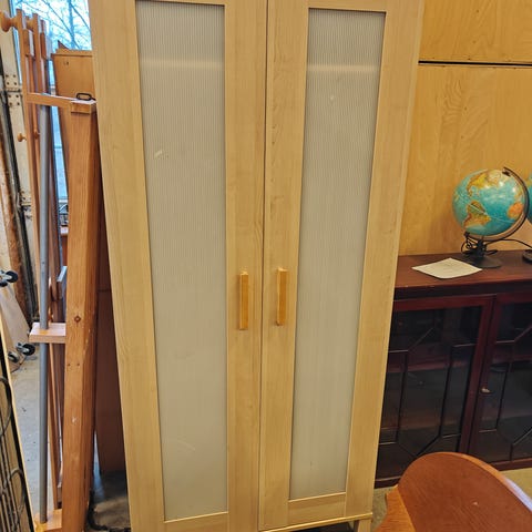 IKEA garderobeskab i trælook. Skabet har tre låger, hvoraf den ene side indeholder bøjlestang og øverste hylde til ophæng af tøj, og den anden side har flere faste hylder til sammenlagt tøj eller opbevaring. Nederst er der to skuffer til ekstra opbevaring. Velegnet som garderobeskab i soveværelse, børneværelse eller entré til opbevaring af tøj, sengetøj og andre tekstiler.