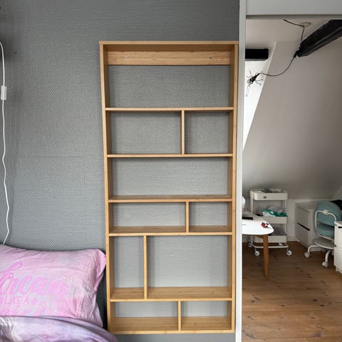 Åben reol i lyst træ med masser af plads til opbevaring.