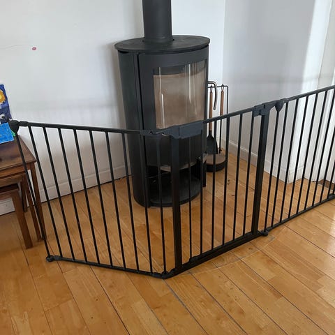 Pejsesikkerhedsgitter i sort metal. Gitteret er velegnet til at afskærme omkring brændeovn eller pejs og kan også bruges som afskærmning i andre områder i hjemmet. Består af 3 sektioner (2 x 90 cm + 102 cm). Er 75 cm højt. Placering og vinkel på sektionerne kan justeres efter behov, så det kan tilpasses forskellige rum og opstillinger.
