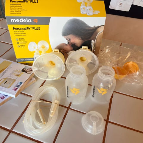 Medela PersonalFit Plus brystpumpe med tilhørende dele og flasker. Sættet indeholder Medela mælkeflasker med låg og brysttragter i str. 24 mm. Egnet til udpumpning og opbevaring af modermælk. Plastdele og flasker er i matchende gul/hvid farve, som vist på billederne. Uden elektronisk pumpeenhed