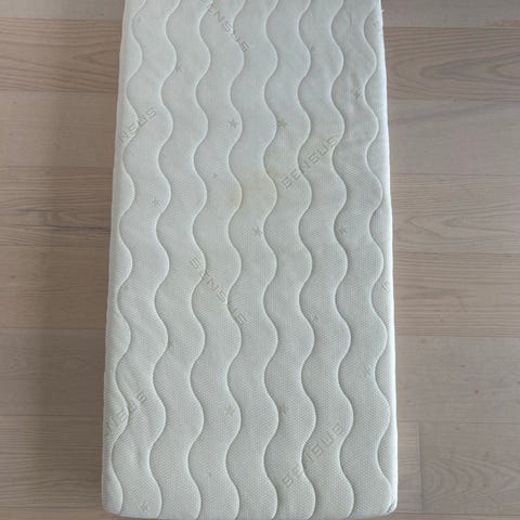 Skummadras fra Jysk med aftageligt, gråblåt stribet betræk. Betrækket har lynlås, så det kan tages af til luftning eller vask. God børnemadras eller gæstemadras.