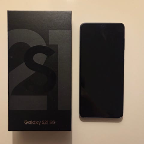 Samsung Galaxy S21+ 5G smartphone med 128 GB intern hukommelse. Telefonen ses i sort farve. På billedet fremgår original emballage samt tilbehør som kabel/øretelefoner og en separat pakke med skærmbeskyttelse. Velegnet til almindelig brug, streaming, apps og lagring af billeder og video med den angivne hukommelseskapacitet.