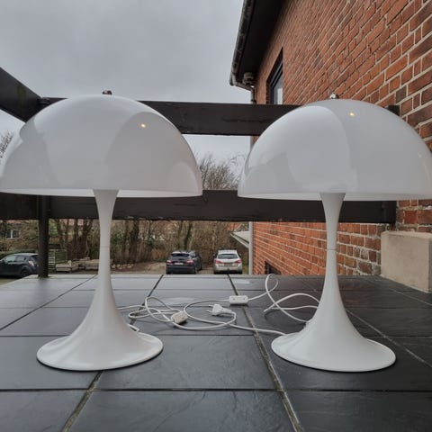 Klassisk bordlampe med halvkugleformet skærm og trompetformet fod i hvidt design. Velegnet som belysning i stue, soveværelse eller på skrivebord og kommode. Giver et diffust og behageligt lys gennem skærmen og ned på underlaget.