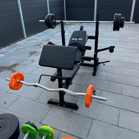 Der medfølger Leg Extension og Upper Body Kit med og jeg har endda også købt nogle vægt skiver (15 - 10 - 10- 5 kg).