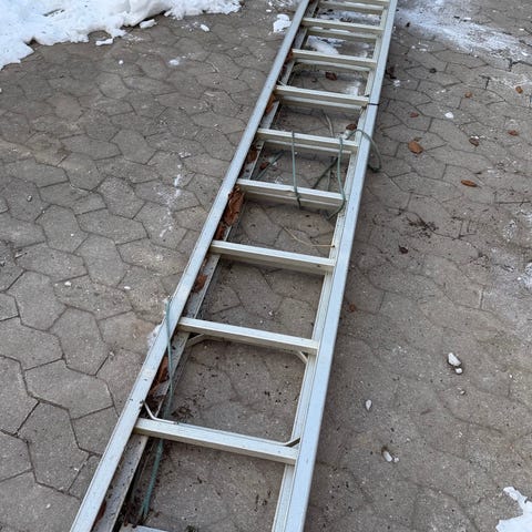Aluminiumstige med firkantede trin. Velegnet til almindelige opgaver i hjemmet, fx adgang til tag, loft eller arbejde i højden udendørs. Stigen fremstår i metal/aluminium med skridsikre trin. Højde 5 meter. Enkelt trin er bøjet.