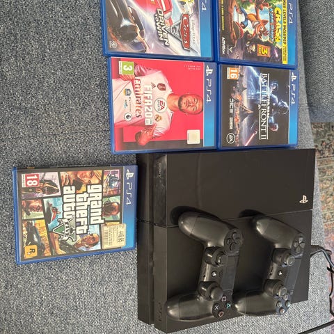 Sony Playstation 4 konsol sort med 2 controllere og spil
