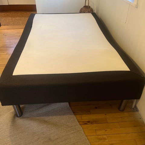 Jysk seng med ben. enkeltseng med polstret mørkgrå ramme og sorte metalben. Topmadras følger ikke med!