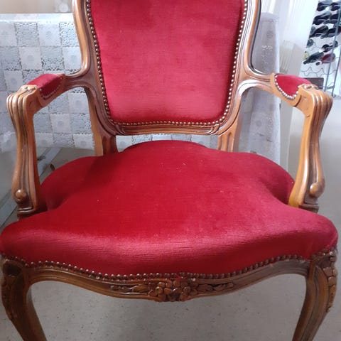 Flot gammel stol i rødt og med frynser nederst.