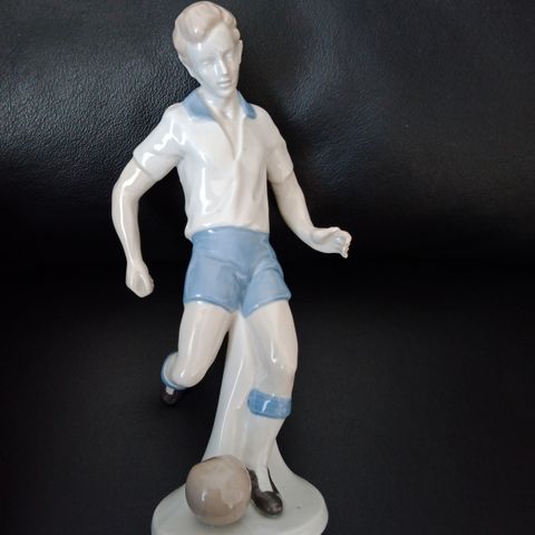 Sparegris udformet som en fodboldfigur med krone og fødder. Figuren er primært gul med røde felter og sorte sko. Der er møntindkast på bagsiden og gummiprop i bunden til tømning. Egnet som sparebøsse til børn eller som dekoration på børneværelse eller hylde for fodboldinteresserede.