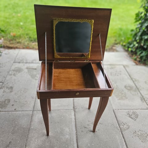 Smykkeskrin i træ i brun farve med orientalsk inspirerede blomster- og fuglemotiver på alle sider. Skrinet har flere skuffer på fronten samt låg, der kan åbnes fra toppen. Metaldetaljer ved lukning og greb. Egnet til opbevaring af smykker, småting eller andre personlige genstande.