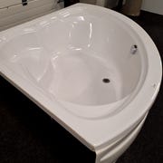 Badekar med rektangulær form og integreret glasfront med dekorative linjer på siden. Badekarret er udstyret med vægmonteret termostatarmatur i krom med bruserhoved og fleksibel bruserslange. Egnet til montering langs væg i badeværelse med flisegulv. Glasfronten giver mulighed for delvis indbygning og skjuler installationer under badekarret. Velegnet til almindelig daglig brug som karbad og bruseplads.