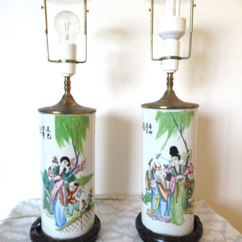 2 stk. flotte kinesiske lamper i porcelæn. Lamperne – kaldet hatstand – er med traditionel kinesisk dekoration og står på originale træskåle. Den ene skærm er med fugtpletter. Lampernes højde (incl. skærm) er 68 cm.