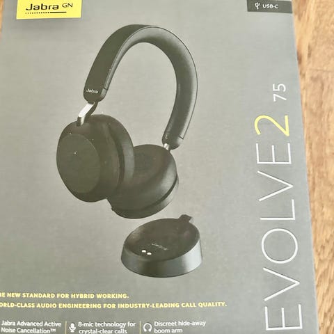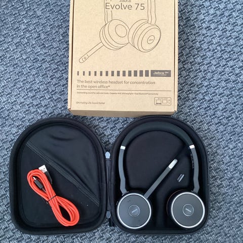 Jabra Evolve 75e trådløse in-ear hovedtelefoner i sort. Neckband-design med ørepropper og medfølgende etui til opbevaring. Velegnet til brug med computer og mobil til tale og musik, f.eks. på kontor eller under transport. Leveres i original æske med bæretaske.