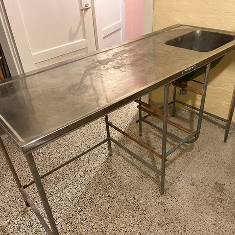 Køkkenbord på hjul med træbordplade og metalhylder