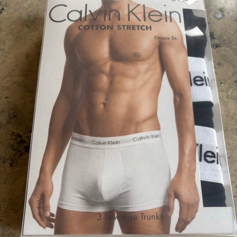 6 par helt nye Calvin Klein Trunk Stretch boksershorts i størrelse L til mænd. Farven er sort, og materialet er bomuld. Fejlkøb, opdagede det først efter de var pakket ud og vasket. Aldrig brugt. Købt for 558 kr.