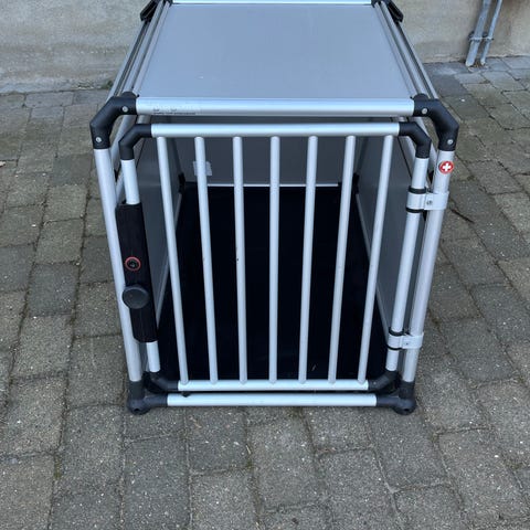 Branford hundebur til bil med 1 dør. Buret er udført i aluminium med sorte plader i sider, bund og top. Fronten har gitter med låge, som kan lukkes med beslag. Konstruktionen er skråt afskåret bagtil, så buret kan tilpasses bagagerum i mange biler. Egnet til transport og sikker placering af hund i bil.