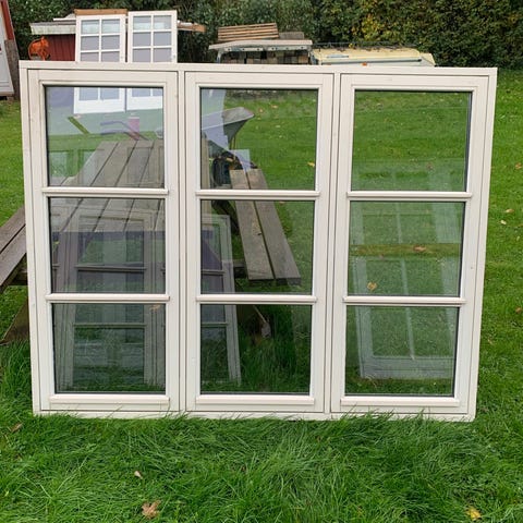 Hvide 3 fags Bondehusvinduer i træ med faste rammer (ikke oplukkelige) 2 lags termoruder.