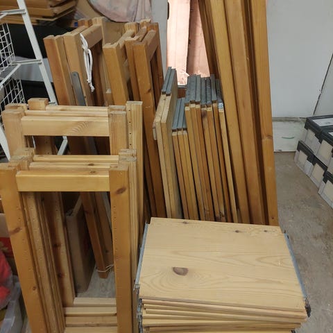 Tidløs ABC reol i skandinavisk fyrretræ. 50 stk hylder i farve whitewash. Sælges i større antal.