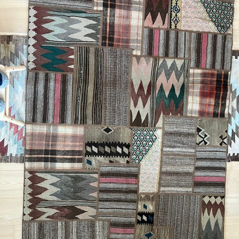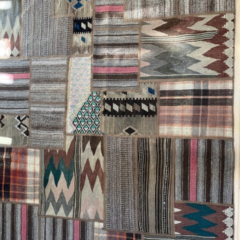 Smukt gulvtæppe, samlet af famle kelimtæpper. Uld med bomulds bagside