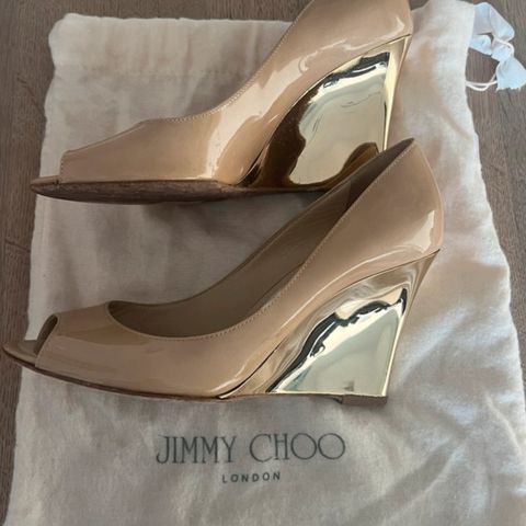 Sælger disse elegante stiletter fra Jimmy Choo i guld-læder. En klassisk model med peep-toe, slingback-rem og lille platform foran, som gør dem mere behagelige at have på i længere tid. Perfekte til bryllup, galla eller sommerfester.