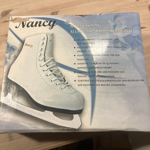 Nancy kunstskøjter i størrelse 32. Klassiske hvide skøjter med snørelukning og figurklinge. Egnet til børn med skostørrelse 32 til brug på skøjtebane eller is. Skøjterne leveres i original æske med modelbetegnelsen Ice Figure Nancy angivet på kassen.