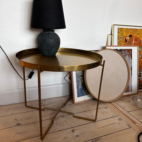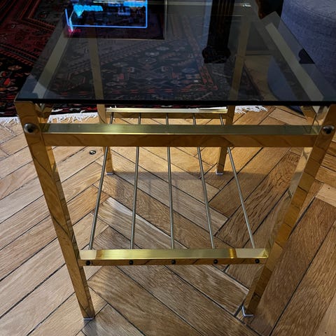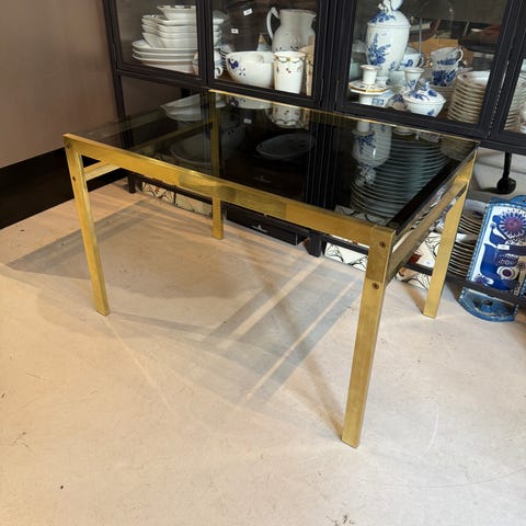 Gammel messing lamoebird med røg glasplade og lille avis hylde. 41 x 41 48 h. Det er ikke Ikea.