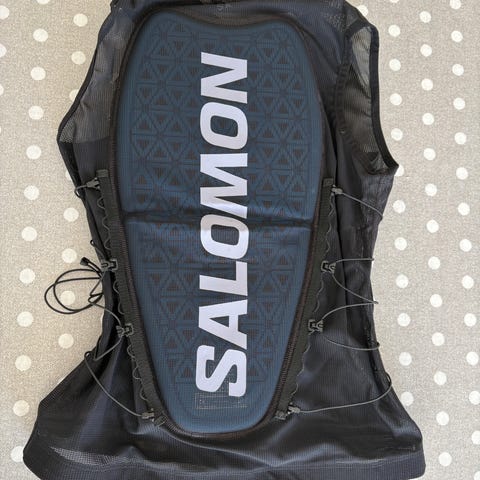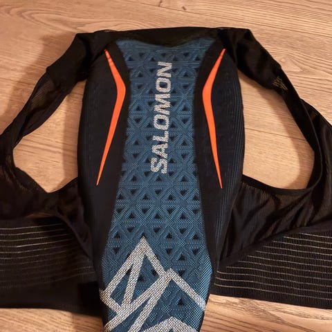 Salomon Flexcell Mesh rygskjold i størrelse L. Rygskjoldet er udført i sort mesh-materiale med blå detaljer og elastisk lukning omkring livet. Designet som en vest, der giver bevægelsesfrihed og ventilation. Egnet til brug ved fx ski, snowboard eller andre aktiviteter, hvor der ønskes ekstra beskyttelse af ryggen.
