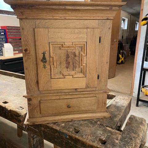 Skabet er i god stand, men alder og brug er tydelig indvendig i de ældste skuffer.