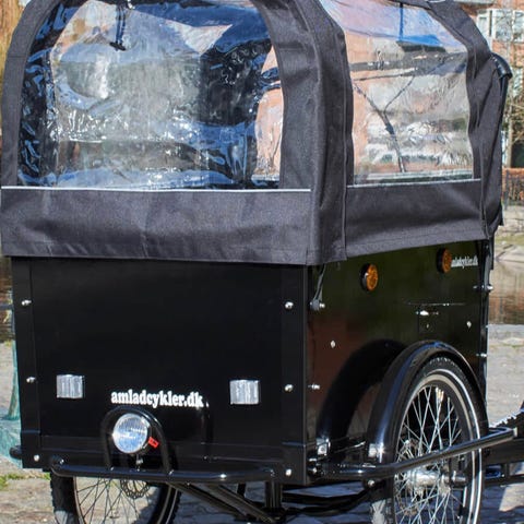 Cargobike of Sweden ladcykel kaleche i sort tekstil med gennemsigtige vinduer i sider, top og bagende. Kalechen dækker ladet og giver beskyttelse mod vejr og vind for passagerer eller last i ladcyklen. Åbnes i begge sider.