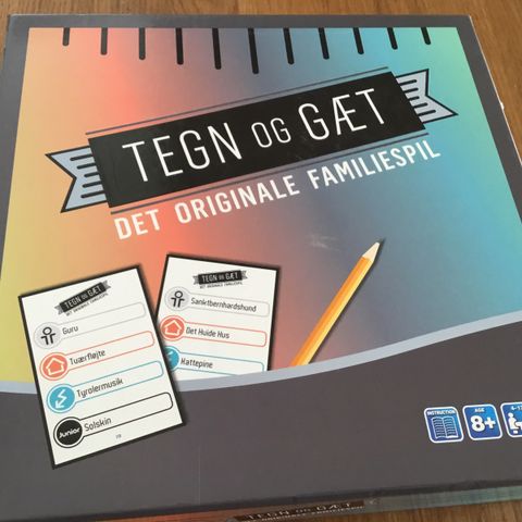 Tegn og Gæt brætspil. Spillet indeholder spilleplade, brikker, kort, blokke og regler til tegne- og gættespil for flere deltagere. Egnet som familiespil og selskabsspil, hvor spillerne skiftes til at tegne ord eller begreber, som de andre skal gætte.